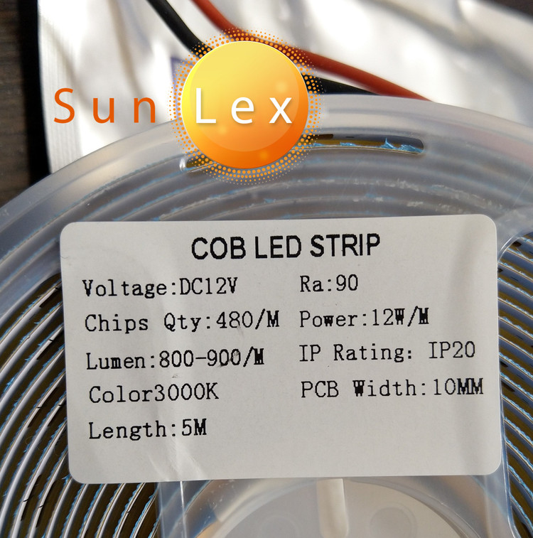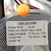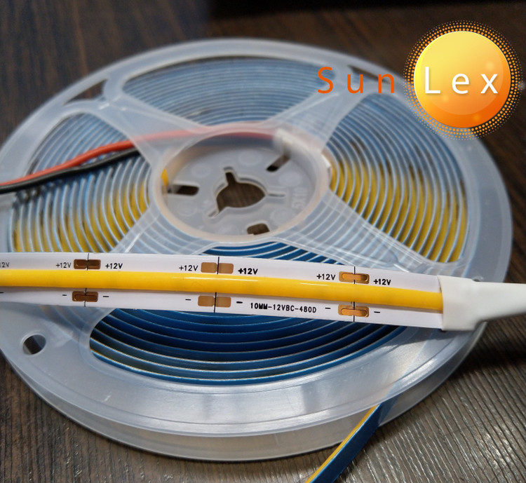 ریسه نواری COB برند سانلکس 12 ولت تراکم 480 پشت چسب دار 5 متری عرض 10 میلی متر آفتابی